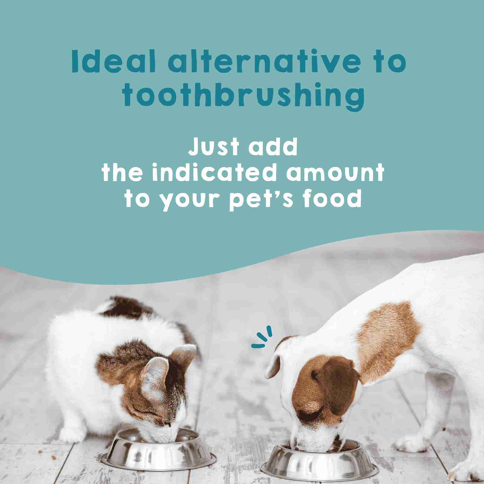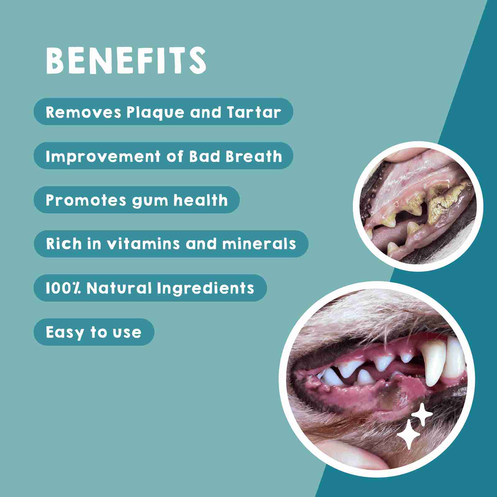 This 100% natural powder supplement helps reduce plaque, prevent tartar and improve breath , all without the need for brushing .