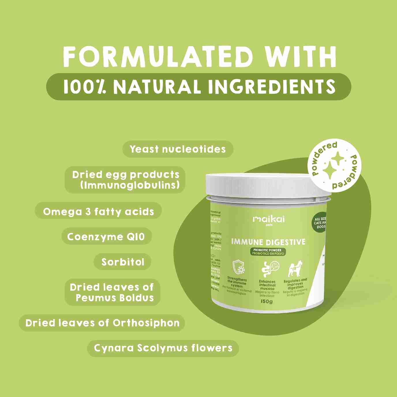Restores intestinal balance, reduces diarrhea and gas, improves digestion and strengthens the immune system of dogs and cats.
