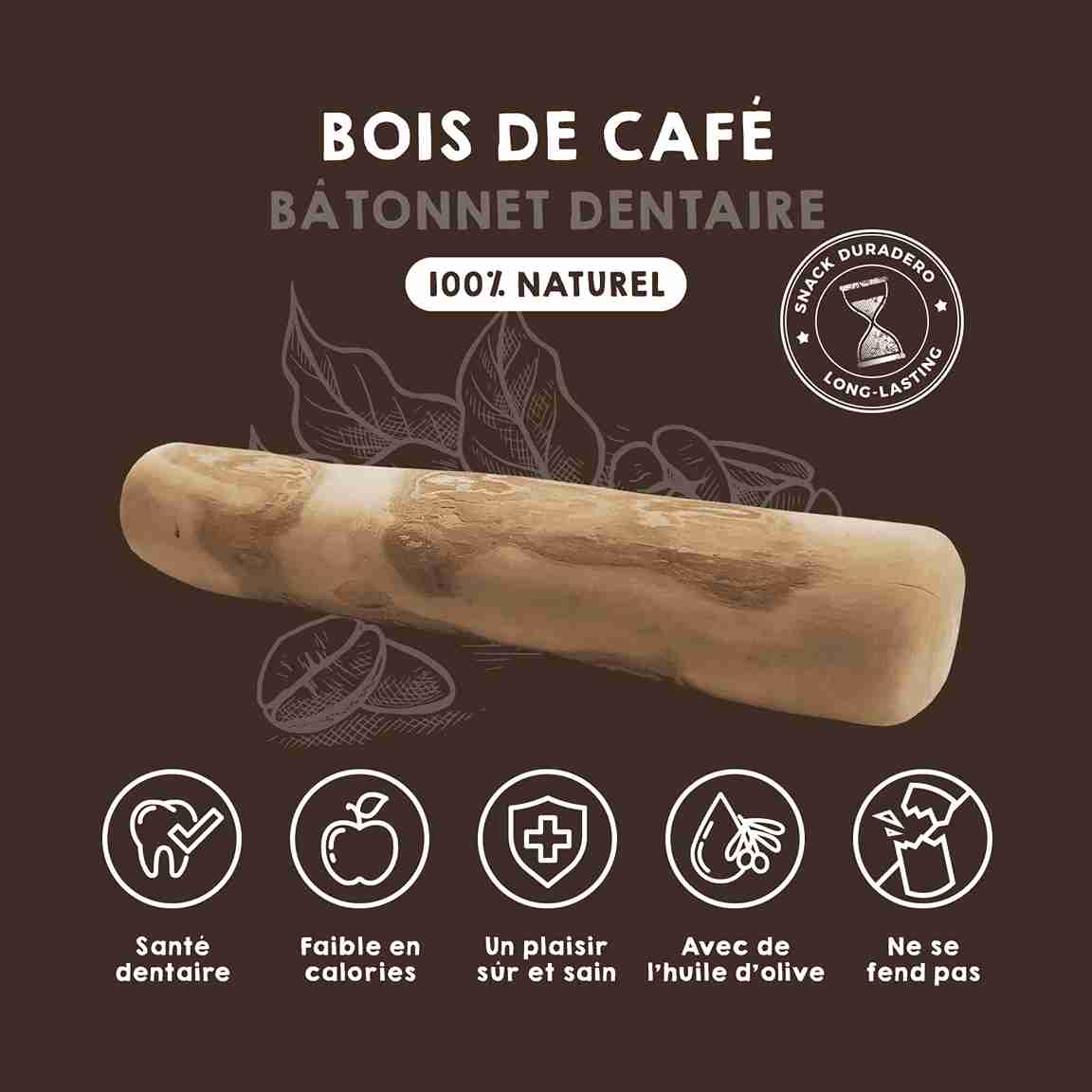 Fabriqué en bois de café naturel, imprégné d’huile d’olive, ce masticatif en bois de café pour chien offre une mastication sûre et durable qui prend soin des dents et des gencives, tout en réduisant le stress et l’anxiété.