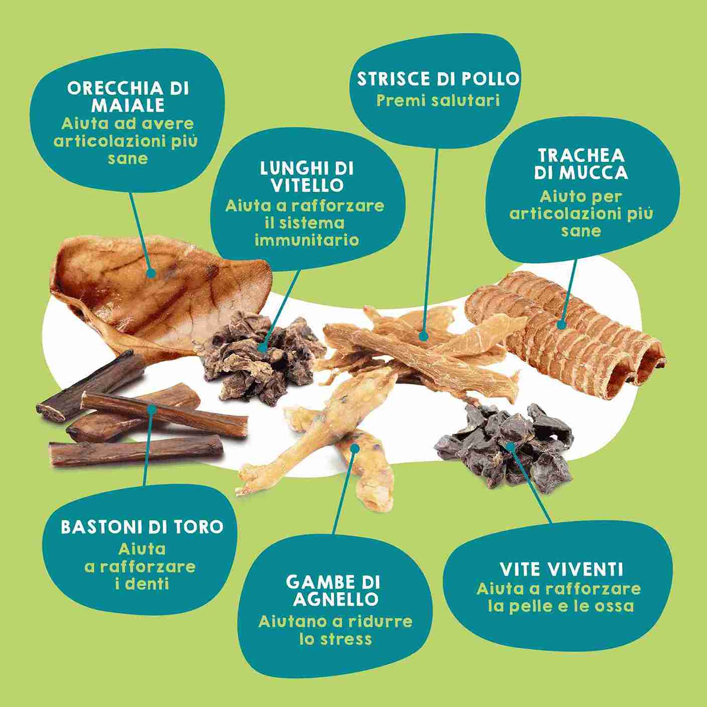 Ogni pacchetto è composto da una selezione di snack naturali 100% disidratati, un barattolo di olio di salmone o masticativi. In base al tipo di pacchetto, il contenuto può variare.